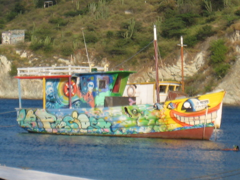 Mi proximo destino era Montañitas, Ecuador, pero pase por las afueras de Quito y pare para sacarme una foto con la Aceituna en el monumento de la mitad del mundo, el Ecuador. Montañitas es un lugar que me interesaba por las famosas olas que se pueden surfear ahi. Una derecha larga que forma un poco de tubo. Para mi sorpresa, Montañitas no es ningun lugar exotico. Cientos de jovenes de entre 18 y 25 años, de origen Argentino y Chileno en su mayoria, llegavan a este lugar a vacacionar. Sinembargo y por suerte, lo que buscaban ellos en Montañitas era la fiesta, joda, carrete o parranda. Digo por suerte, porque una caracteristica de esta ola es que hay uno o dos picos nomas, por lo que mucha gente en el agua (mas de 15) ya hacen que sean muchos para compartir. Yo me levantaba a las 6 de la manana, ya de dia, y caminaba a la playa que me quedaba a 5 minutos. De camino a la playa tenia que atravesar la parte centrica y la zona que aun estaba a plena fiesta (meta tema brasilero de moda). En la playa, parejas romanticas mirando el amanecer, algunos refrescandose en el mar y como no, varios borrachos dormiendo retorcidos en el arena, como los troncos que saca la marea por la noche. Esos borrachos que al otro dia tienen dolor de espalda y dicen, no se porque me duele, no hice nada, jeje. En el mar, solo gente mayor, probablemente padres de alguno de los que me cruze en el camino, y yo. Hasta las 8 de la manana, no mas de 5 en el agua, perfecto. A las 8 empezaban a caer algunos que no se habian acostado y otros que solo habian dormido un par de horas. La cara y los movimientos erraticos los delataba, y ni hablar del momento de tomar una ola,ejeje. Esos era como si no estubieran presentes, 0 a la izquierda. Ya a las 9 caia la gente de a montones. A las 9 y media, ya imposible agarrar una hola y era ahi cuando regresaba para mi guarida por estos dias, La Aceituna. Fueron 3 dias de exelente surf. Me estube quedando en un hostel, pero durmiendo en la van, era temporada alta y los presios eran muy altos. En este lugar, me dejaban usar los banos y la cocina. Ademas la familia duena del hostel era muy buena compania.